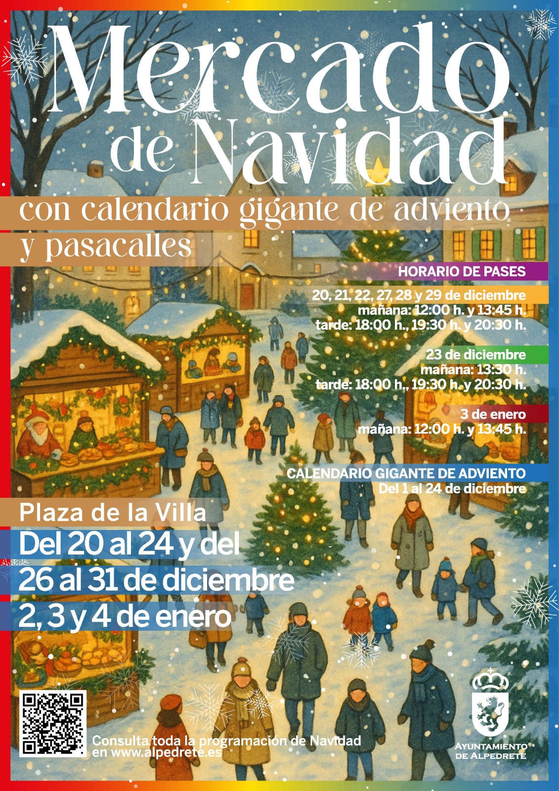 El Mercado de la Navidad de Alpedrete, un espacio para la magia y el espíritu navideño llega a la localidad a partir del 20 de diciembre. Se trata de una apuesta por un espacio común para los vecinos con gran ambiente navideño, con calendario gigante de adviento y pasacalles que tendrán diversos pases a lo largo del día en horario de mañana y de tarde. Esta propuesta se encontrará en la Plaza de la Villa del 20 al 24 y del 26 al 31 de diciembre, y del 2 al 4 de enero.