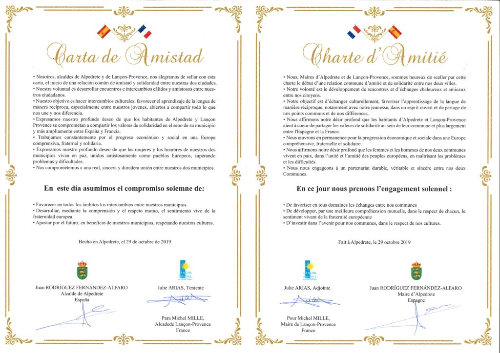 En la rueda de prensa previa a la firma de la carta de amistad, la teniente de alcalde de Lançon-Provence, Julie Arias, destacó la importancia de este acuerdo y declaró que “el proyecto de hermanamiento es muy importante para nosotros porque cumple con nuestro deber de memoria transmitiendo nuestra historia y cultura más allá de las fronteras de nuestro país.” En este sentido añadió que “el hermanamiento se produce en el sentido literal de la palabra, donde los vecinos de Alpedrete son acogidos como vecinos de Lançon-Provence y viceversa”. Por último, comento que “nuestros ayuntamientos trabajarán a partir de ahora para que esta unión que es el punto de inicio de una historia común entre nuestros pueblos perdure en el tiempo.”