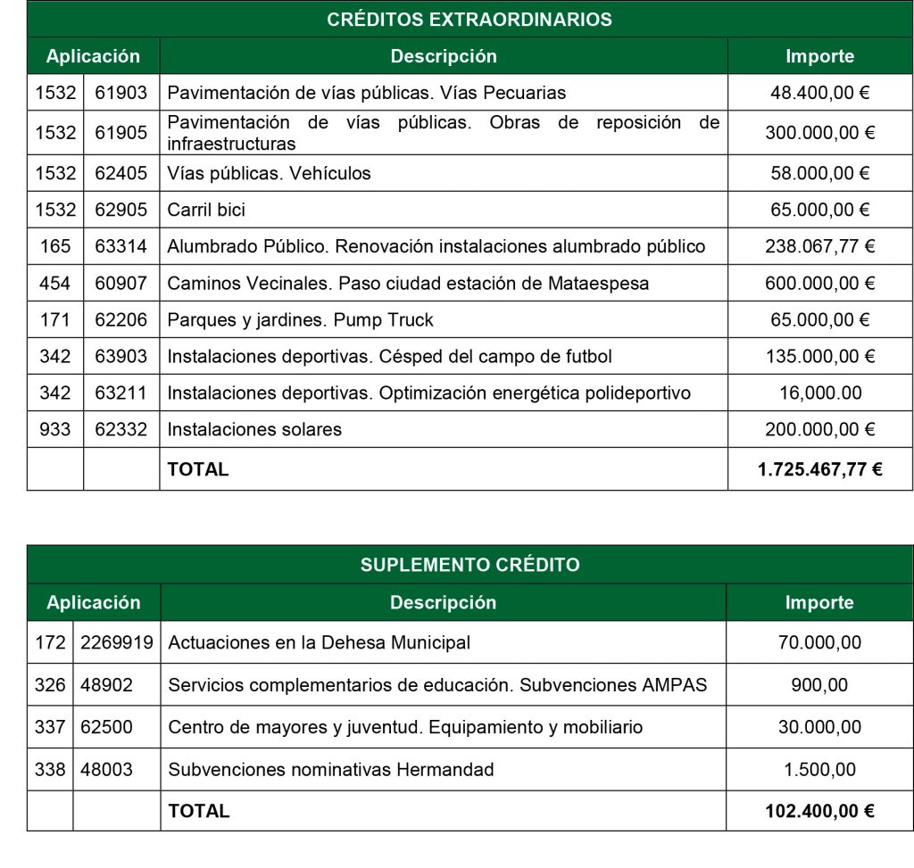 Las inversiones previstas se distribuyen en múltiples áreas municipales: Obra pública, deportes, movilidad, energía, medio ambiente, mayores, educación, juventud y los proyectos aprobados por la ciudadanía a través de los presupuestos participativos. El detalle del crédito aprobado y del suplemento de crédito es el siguiente: