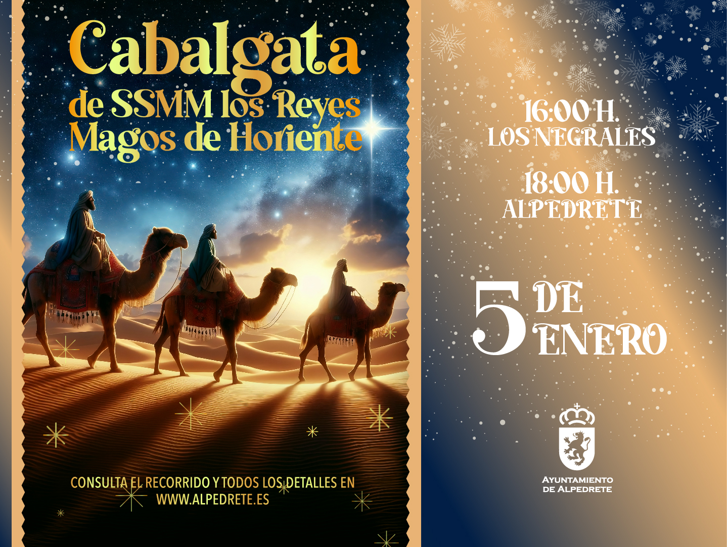 La Cabalgata de Reyes 2026 discurrirá por Los Negrales y por el casco urbano de Alpedrete, como cada año. La jornada del 5 de enero recibiremos la visita de SSMM los Reyes Magos de Oriente, acompañados de los pajes y mucho color y magia.