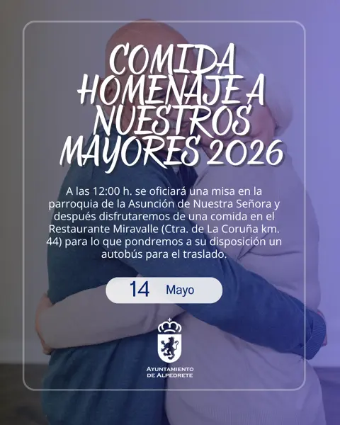 El Ayuntamiento de Alpedrete tiene el gusto de invitarle el próximo día 14 de mayo a la celebración del Homenaje a los Mayores (solo para personas mayores de 75 años empadronadas en el municipio) y así compartir un rato juntos.