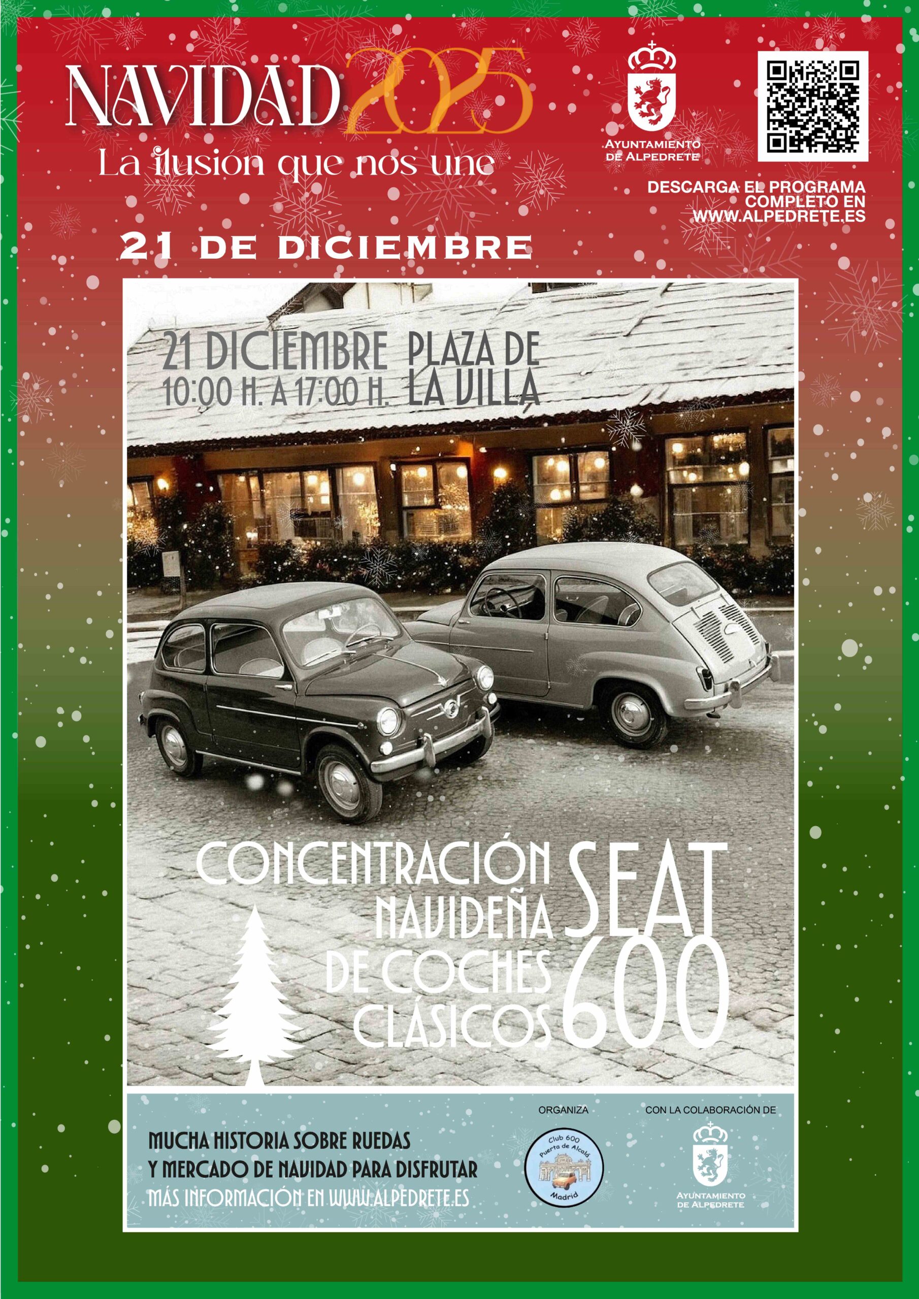 La plaza de la Villa se llenará de historia sobre ruedas el próximo domingo 21 de diciembre, con la celebración de la concentración Navideña de Coches Clásicos “600”, un encuentro que cada año reúne a aficionados de toda la región y que en esta ocasión acogemos en nuestro municipio. La cita está organizada por la Asociación Club Seat 600 Puerta de Alcalá de Madrid, con la colaboración del Ayuntamiento de Alpedrete.