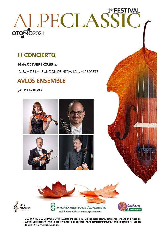 Continua el Festival Alpeclassic 2021 con el tercer concierto que tendrá lugar el sábado 16 de octubre a las 20:00h en la Parroquia de la Asunción de Nuestra Señora de Alpedrete cargo de la formación AVLOS ENSEMBLE.