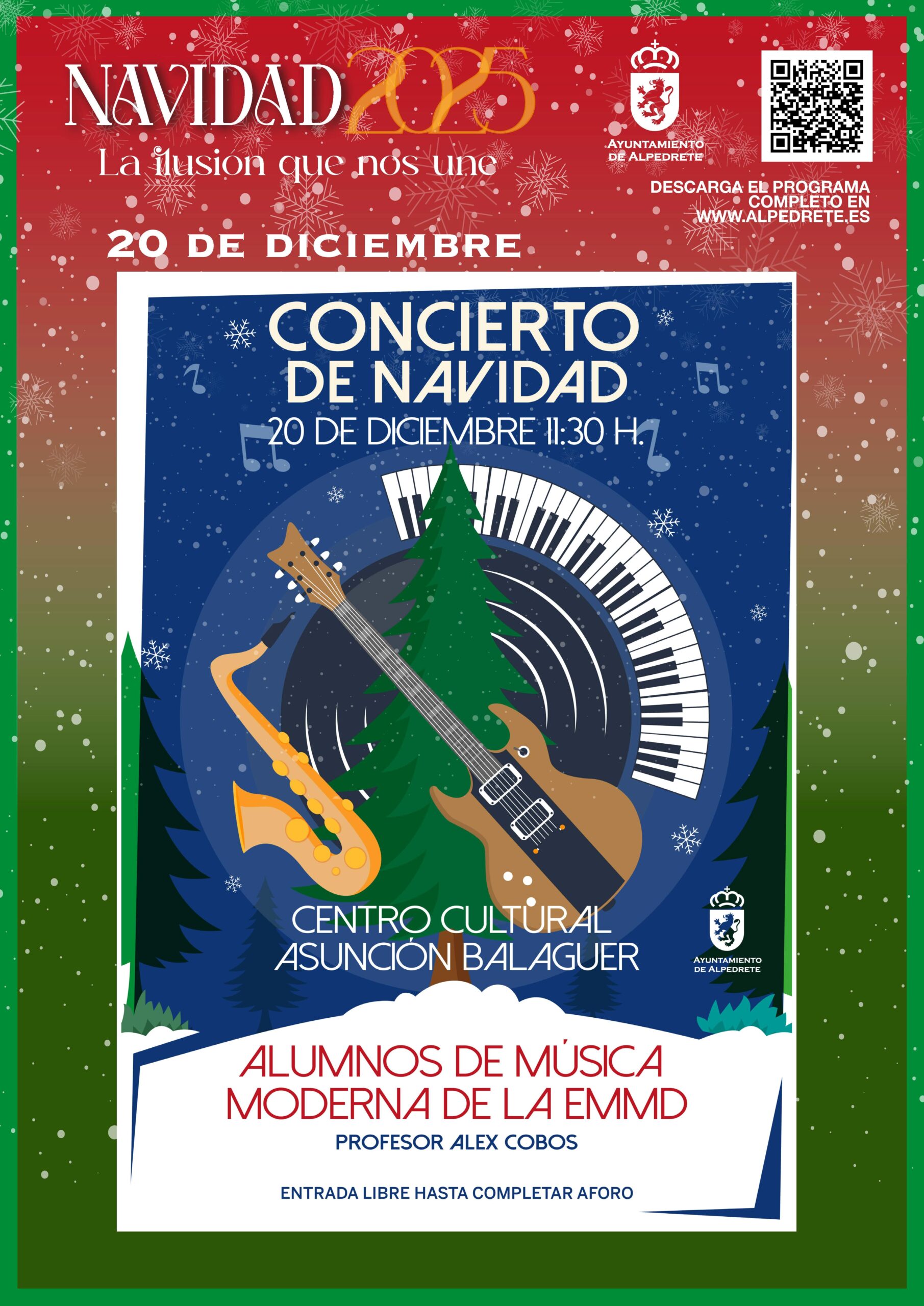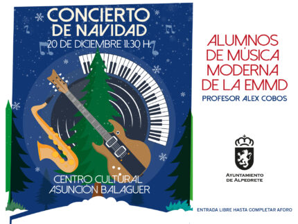 El viernes 20 de diciembre a las 11:30 h, el Centro Cultural Asunción Balaguer acogerá el Concierto de Navidad de los alumnos de música moderna de la Escuela Municipal de Música y Danza (EMMD) de Alpedrete, una cita perfecta para disfrutar de la música en directo.