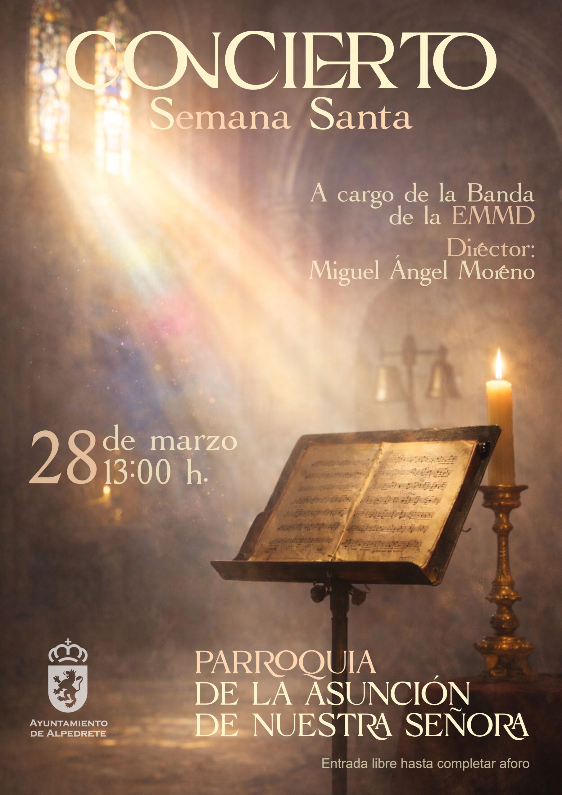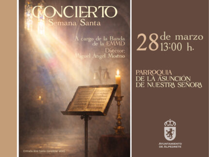 « Todos los EventosConcierto de Semana Santa. Banda sinfónica de la EMMD28 marzo 2026, 13:00Navegación del Evento« Videoconferencia. “Pinceladas invisibles. Un tour por la historia del arte: Georgia O’Keefer”“Único”, un espectáculo de clown para toda la familia »Tradicional concierto de Semana Santa de bandas de procesión.+ Google Calendar+ Exportación de iCal Detalles Fecha: 28 marzo 2026 Hora: 13:00Categoría del Evento:ConciertoEtiquetas del Evento:Cultura, EMMD, Semana Santa, Banda, concierto, Música Local Parroquia Asunción de Nuestra Señora Plaza de la Villa Alpedrete, Madrid 28430 España + Google Map