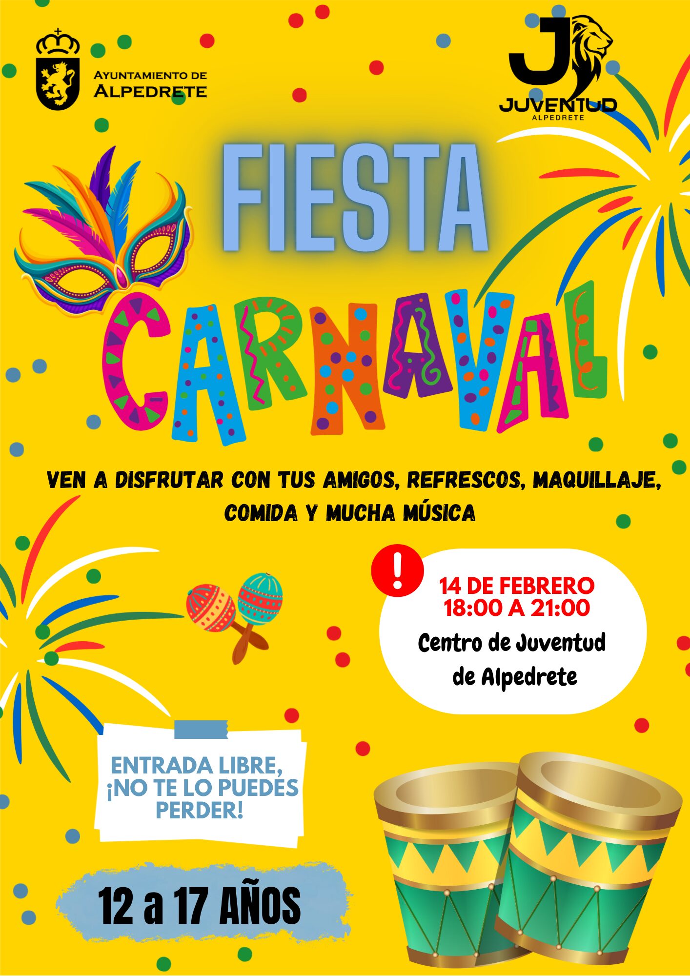 El Centro de Juventud de Alpedrete celebrará una Fiesta de carnaval el 14 de febrero, dirigida a jóvenes de 12 a 17 años, para disfrutar de una tarde diferente en un ambiente festivo y lleno de música. La actividad tendrá lugar de 18:00 a 21:00 h e incluirá refrescos, comida, maquillaje y mucha música, con la invitación a asistir con disfraz y compartir el Carnaval con amigos. La entrada es libre hasta completar aforo.