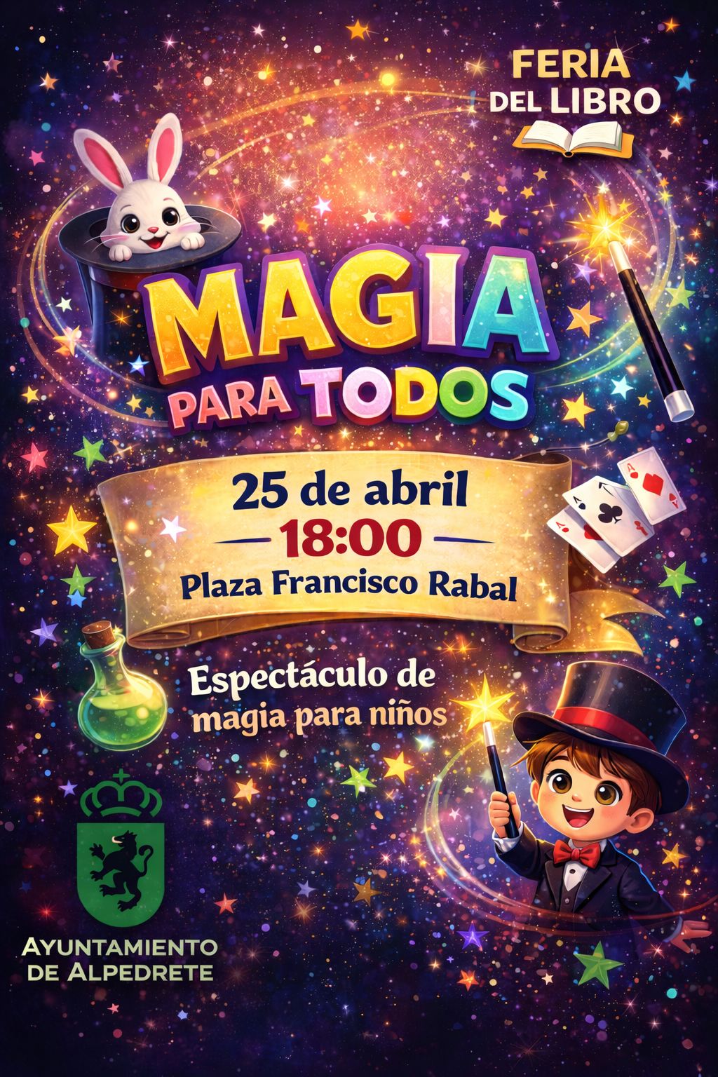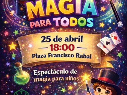 « Todos los EventosMagia para todos25 abril 2026, 18:00 - 19:00Navegación del Evento« Cuentitis Musiquitis“Colorín Colorado”: Teatro infantil »18.00 h.: “Magia para todos”: Espectáculo de magia+ Google Calendar+ Exportación de iCal Detalles Fecha: 25 abril 2026 Hora: 18:00 - 19:00 Local Plaza de Francisco Rabal Plaza de Francisco Rabal s/n Alpedrete, Madrid 28430 España + Google Map