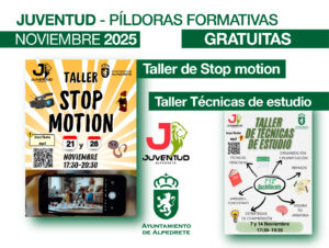 La concejalía de Juventud del Ayuntamiento de Alpedrete ofrece en noviembre propuestas gratuitas de formación con el objeto de mejorar habilidades clave dentro y fuera del aula. Las plazas se asignarán por orden de inscripción y tendrán preferencia las personas empadronadas en Alpedrete. Los talleres se realizarán presencialmente en el Centro de Juventud. Taller de Técnicas de Estudio (1º y 2º de Bachillerato) Fechas y horario: 7 y 14 de noviembre, de 17:30 a 19:30 h (2 sesiones). Actividad: gratuita. Preferencia empadronados/as en Alpedrete. Plazas: mínimo 8 y máximo 12 participantes. Inscripción: https://form.jotform.com/252824564966369 Contenidos Organización y planificación del estudio (agenda, métodos de trabajo y gestión del tiempo). Estrategias de comprensión y repaso. Técnicas mnemotécnicas y elaboración de mapas mentales. Mejora de la concentración y la memoria. Manejo del estrés académico y preparación de exámenes. Más información sobre otros talleres en noviembre aquí