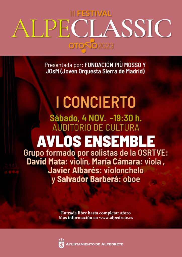 Sábado 4 de noviembre, 19:30 h : AVLOS ENSEMBLE Cuatro solistas de la OSRTVE con amplio recorrido musical. El cuarteto lleva tocando como tal 3 años, y han actuado en importantes auditorios nacionales e internacionales. -David Mata, violín -María Cámara, viola -Javier Albarés, violonchelo -Salvador Barberá, oboe. Programa EDWARD ELGAR ( 1857-1934) -Andante sostenuto y allegro (6 minutos ) FRANZ SCHUBERT (1797-1928) Sinfonía Nº8 “INCOMPLETA” D.759 - Primer movimiento (14 minutos) JOSEPH HOROVITZ (1926-2020) - Cuarteto Op.18 para oboe y trío de cuerdas I. Allegro II. Larghetto III. Molto allegro. (14 minutos) MALCOLM ARNOLD (1921-2006) -Cuarteto Op.61 para oboe y trío de cuerdas I. Allegro II. Allegretto III. Vivo. Vivace con brio (12 minutos) ARTURO MÁRQUEZ (1950) - Danzón Nº.2. (10 minutos) BIS (La misión, Oblivion…) La entrada es libre hasta completar aforo. Más información sobre el programa completo del III Festival Alpeclassic en este enlace