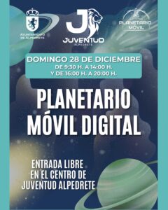 La concejalía de Juventud ofrece esta actividad dentro de su programación especial de Navidad. Este 28 de diciembre el Centro de Juventud de Alpedrete se transforma en una pequeña nave espacial: una gran cúpula hinchable con proyecciones inmersivas sobre astronomía para mirar el universo con otros ojos. Durante toda la jornada habrá distintas sesiones guiadas por un monitor, que irá explicando lo que se ve en pantalla y resolviendo dudas en directo. Por la mañana, las proyecciones estarán pensadas para público infantil y familiar. Por la tarde, el contenido se orientará a adolescentes y adultos. Las sesiones se realizarán con pases cada 40 minutos, con un máximo de 20 personas por pase. La entrada es libre, hasta completar el aforo de cada sesión. Horario: De 9:30 a 14:00 h y de 16:00 a 20:00 hLugar: Centro de Juventud de AlpedreteDuración de cada pase: 40 minutosAforo por pase: 20 personasAcceso: Entrada libre hasta completar aforo por pase ¿Conoces todas las actividades que tenemos preparadas esta Navidad? consúltalas en este enlace.