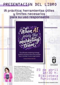 Este 23 de abril, Día del Libro, la literatura se encuentra con el futuro. La Biblioteca Municipal te invita a las 18:30 h. a la presentación del libro "When AI joins the marketing team", de Cristina Peñaloza Morales, un viaje a través de la IA. Celebremos el 23 de abril explorando cómo la tecnología está redefiniendo nuestra creatividad. IA práctica: herramientas útiles y límites necesarios para su uso responsable: La Inteligencia Artificial ya forma parte de nuestra vida diaria. En esta charla descubrirás cómo utilizarla de forma responsable y ética, evitando riesgos como la desinformación o la pérdida de pensamiento crítico, y conocerás las mejores herramientas de IA para mejorar tu productividad, informarte mejor y automatizar tareas en tu día a día. Una sesión práctica y accesible para entender qué puede hacer la IA por ti… y qué nunca debería hacer en tu lugar. Autora: Cristina Peñaloza Morales, Ingeniera en Informática y con un Máster en Negocios (MBA), es estratega de marketing y profesora universitaria especializada en la integración de inteligencia artificial en organizaciones reales. Combina experiencia corporativa y académica para ayudar a equipos y marcas a convertir la tecnología en una ventaja competitiva basada en propósito, storytelling y conexión humana. Su enfoque une estrategia, ética y creatividad, defendiendo que la IA no reemplaza el talento, sino que lo potencia. Dale un giro al Día del Libro: asómate al futuro…