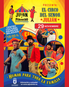 El próximo sábado 29 de noviembre, se llevará a cabo la última cita de la agenda cultural en noviembre, antes de arrancar con toda la programación de Navidad. “El circo del señor Julián” llega a la localidad para hacer disfrutar a grandes y pequeños del humor, la magia y el espectáculo. Pendorcho (el payaso en prácticas) preparará todo para que la función salga perfecta... Cuando el Señor Julián se dispone acomenzar el espectáculo, Pendorcho le advierte de que todos los artistas se han marchado. Incluida Beba, la estrella de la compañía!¿Cómo saldrán de esta situación? ¿Podrán sacar adelante la función ellos dos solos? ¡Pasen y vean! El circo del Señor Julián. Un show de Circo Magia y humor para toda la familia. Sábado 29 de noviembre, 18:00 horas Centro Cultural Asunción Balaguer Un espectáculo para toda la familia. Entradas disponibles en este enlace