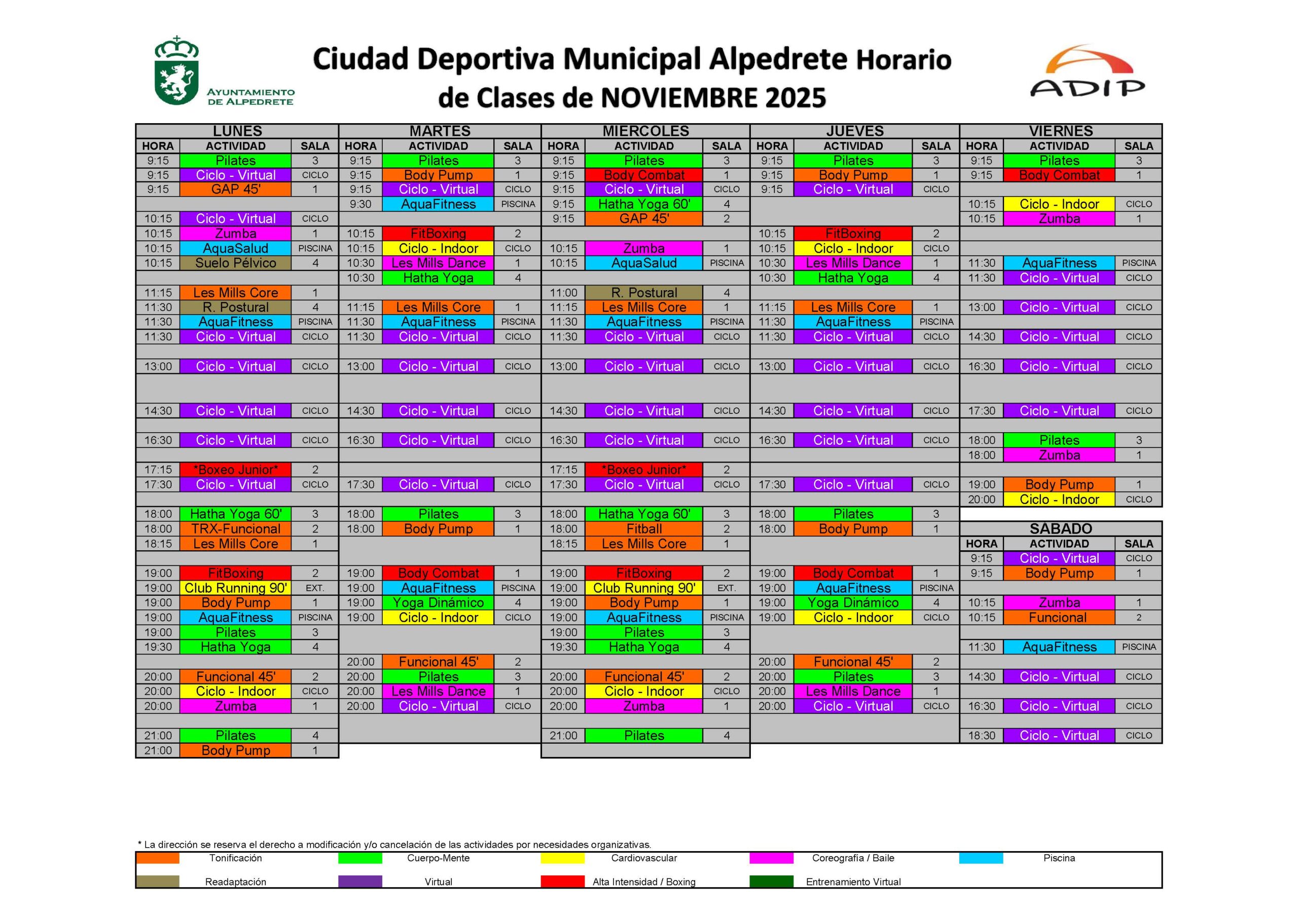 Informamos a continuación del horario de las actividades que se van a desarrollar en el mes de noviembre en la Ciudad Deportiva Municipal de Alpedrete.
