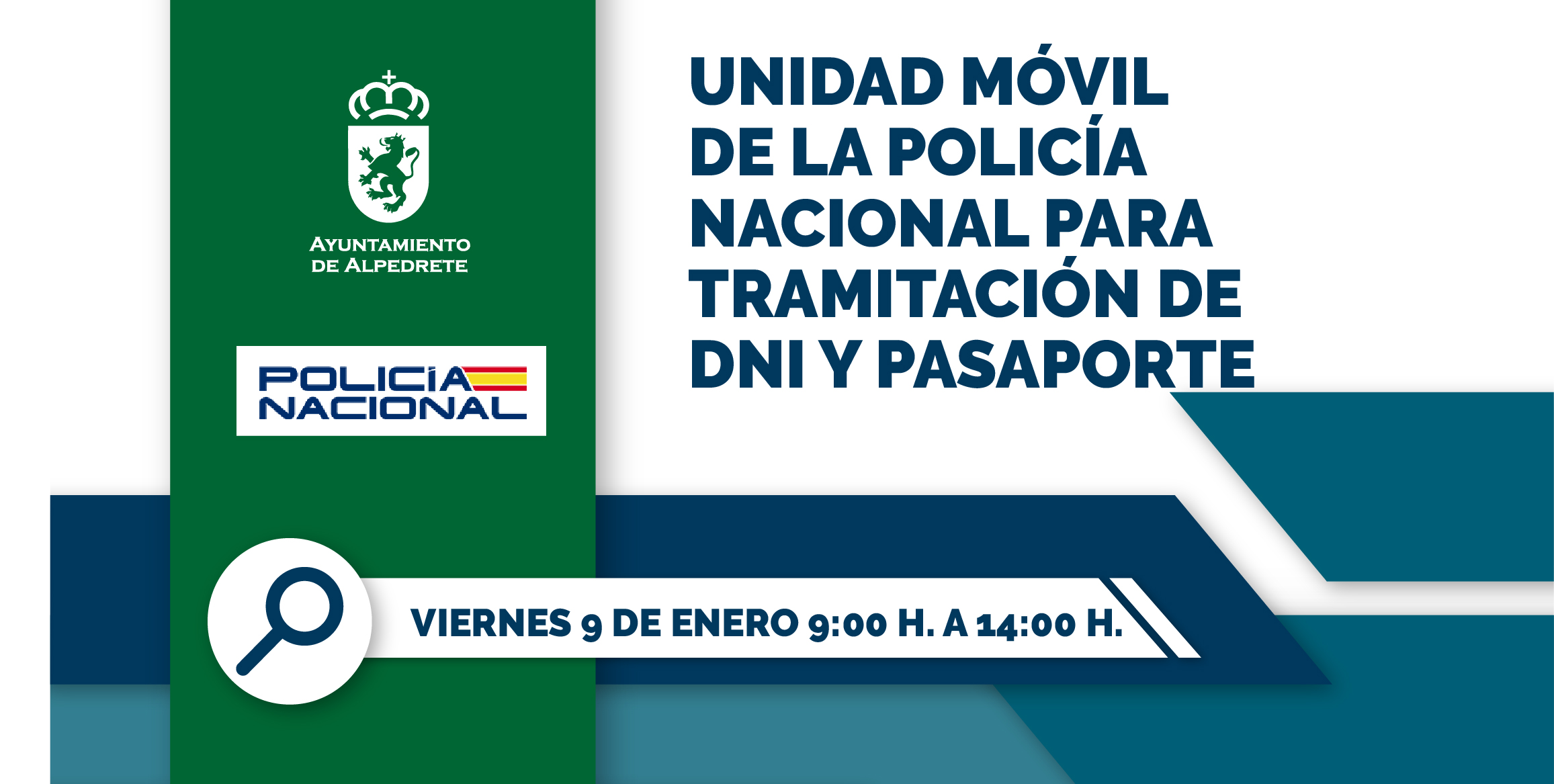 La unidad móvil de la Policía Nacional se desplazará a Alpedrete el próximo 9 de enero para facilitar la tramitación del DNI y del pasaporte sin necesidad de desplazarse a una comisaría. El servicio se prestará en la Plaza de la Villa, en horario de 9:00 a 14:00 horas. Importante: solo se atenderá mediante cita previa, que se puede obtener en el teléfono de la Policía Local: 600 50 03 12.