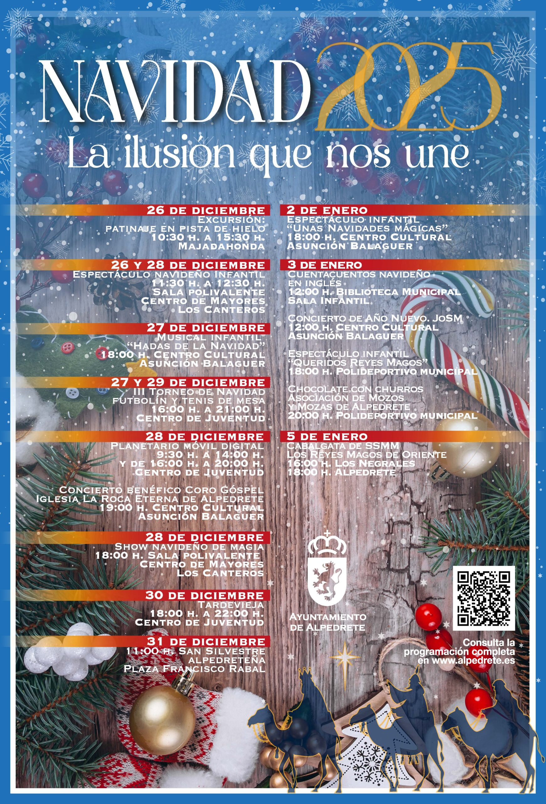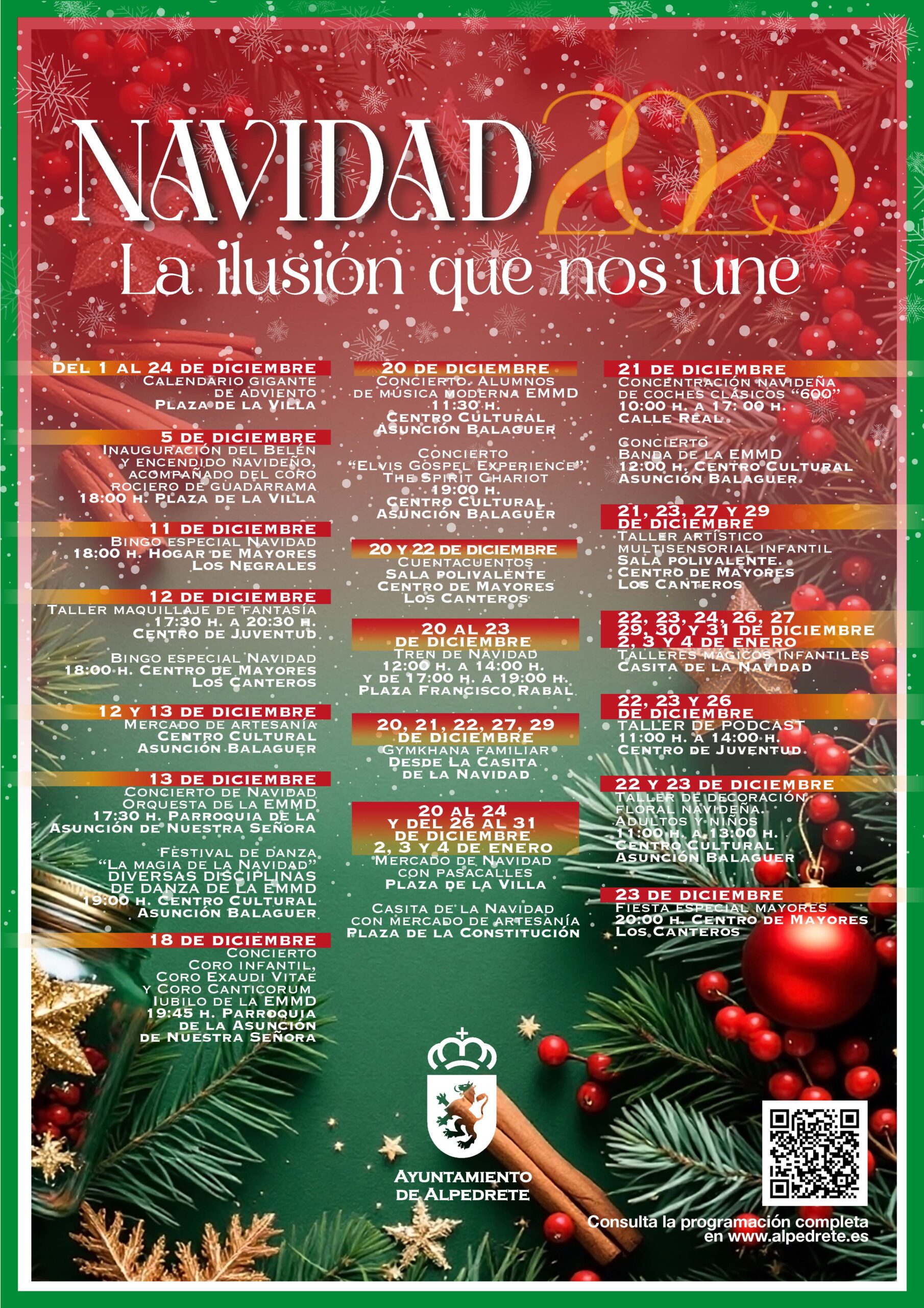 La Navidad en Alpedrete tendrá muchas citas culturales. El 12 y el 13 de diciembre se celebrará el Mercado de Artesanía, con los artesanos locales en el Centro Cultural Asunción Balaguer. El 13 de diciembre tendrá lugar el Concierto de Navidad con la Orquesta de la EMMD a las 17:30 horas en la Parroquia de la Asunción de Nuestra Señora y el Festival de Danza “La magia de la Navidad” con diversas disciplinas de danza de la EMMD a las 19:00 horas en el Centro Cultural.